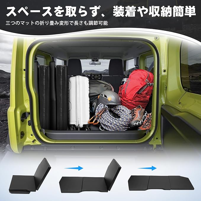 5.【三つ折リコンパクト専用設計・装着や収納が簡単】装着や収納には便利な三つ折り設計のジムニー専用車中泊マットで、お車にぴったり合うように設計されています。三つ折りたたみ式で、取り出して置くだけ装着すぐ完了!お手入れはめちゃ簡単❕使わないときは、折りたたんで収納完了。