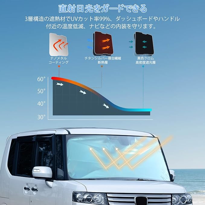 【車内温度の低減】車用サンシェードは高品質素材のナノメタルコーティング、チタンシルバー複合繊維断熱層や黒色クロム高密度遮光層を合わせる設計で、三重遮熱効果により、光の透過率を99%カットし、紫外線や熱や日光の遮断効果が良いです。ダッシュボード、ハンドル、シートなど内装の劣化を防ぎます。暑い時期は早速使用したら、車内の温度が緩和され、ハンドルもそんなに熱くなく、快適に運転できます。エアコンの負担を軽減し、省エネ効果も抜群で、お昼寝するのも快適です。