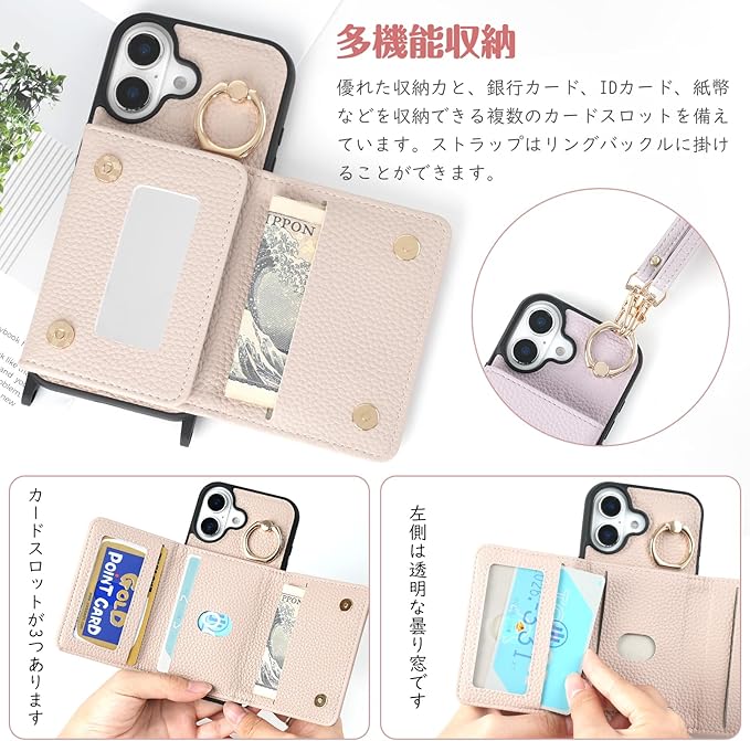 iPhone 17 ケース 手帳型 iPhone17 スマホケース あいほん 17 財布型 携帯カバー アイフォン17 ケース ショルダーストラップ付き 耐衝撃 防盜機能 (カード収納/化粧鏡/リング付き) おしゃれ 可愛い 女性向け 斜め掛け 背面収納対応(アプリコット) | etshop