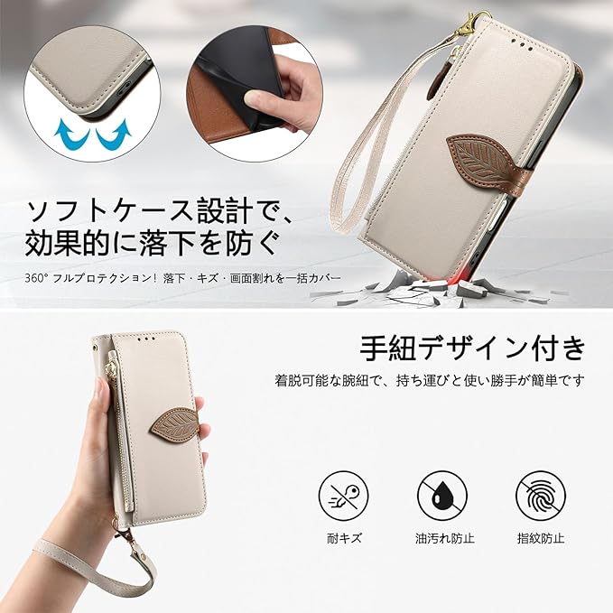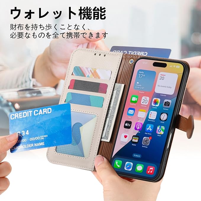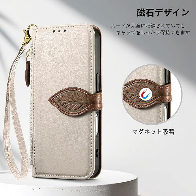 カード収納: アイフォン17 ケース 手帳型 の内側には3つのカードスロット、外側には小銭入れとして使えるサイドのジッパーポケットを備えており、交通系ICカードや日常的に使う銀行カード、写真などをすっきり収納できます。前面のマグネットボタン設計で財布としても使いやすく、スマホひとつ持ってお買い物に出かけられます