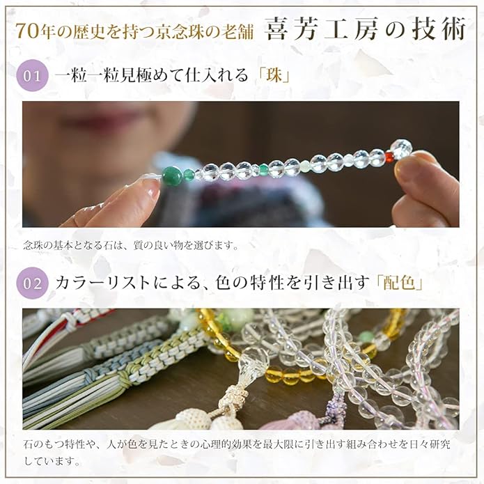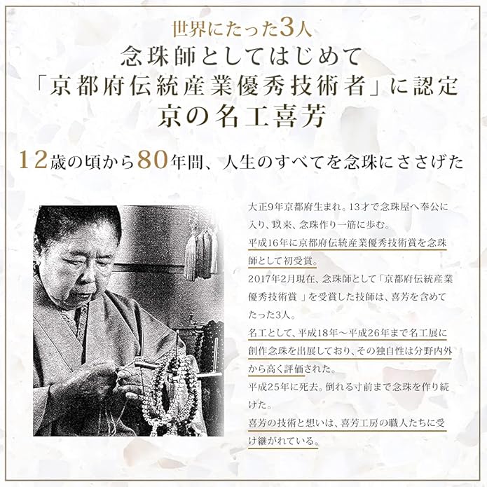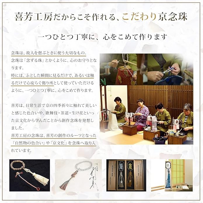 【 京都府伝統産業優秀技術者 喜芳の愛弟子が匠の技で仕立てる京念珠 】 世界にたった3人しかいない、京都府伝統産業優秀技術者の念珠師である京の名工 喜芳。その類まれなる技術を引き継いだ喜芳工房の職人が一つひとつ真心をこめてお仕立てしています。