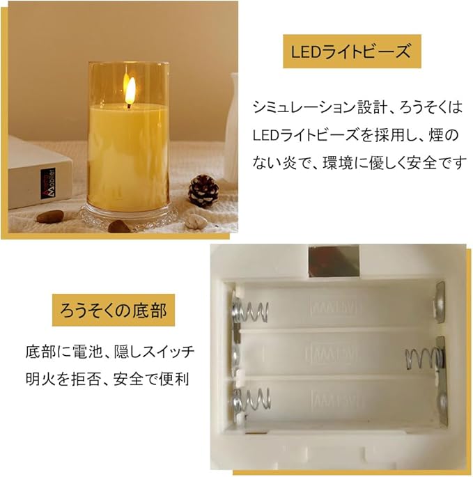 【セット内容】LEDキャンドル 3本 サイズ:S(直径8cm 高さ10cm)、M (直径8cm 高さ12.5cm)、L(直径8cm 高さ15cm)、単3電池(別売り)