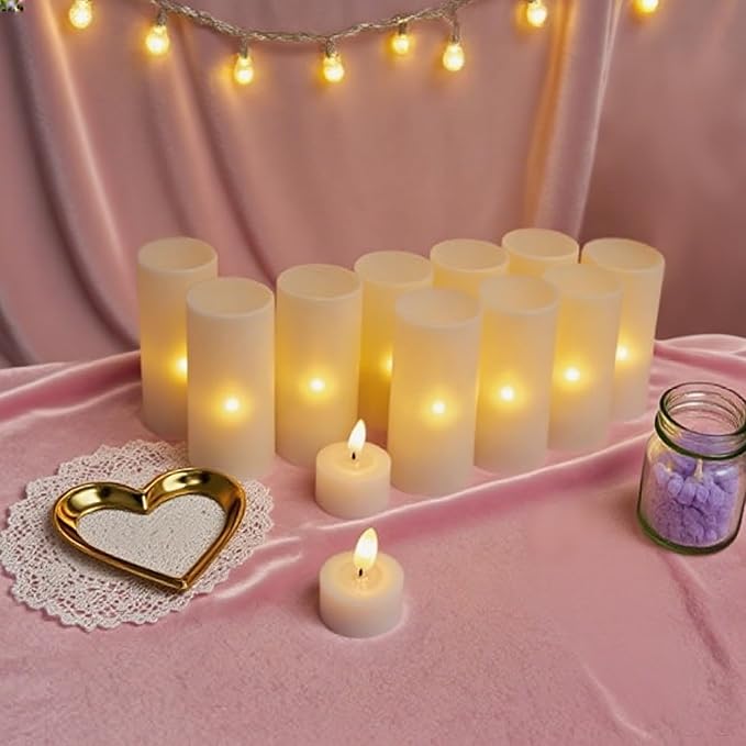【フロストカップが光を和らげ、ロマンチックな雰囲気を演出 】:12個入りのLEDティーライトには、リモコン1個、充電ケーブル1本、充電杭1本、取扱説明書1冊が付属しています。さらに、12個のプラスチック製フロストカップを、揺らめくフレームレスキャンドルの上に置くと、美しいランタン効果が生まれ、光が柔らかく拡散され、お部屋に完璧な雰囲気を作り出します!