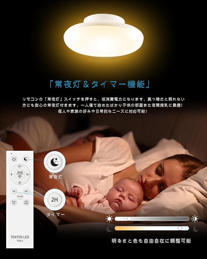 ✅【常夜灯モード&記憶機能&タイマー機能搭載】◉低消費電力の常夜灯を備えており、お子様の一人寝や夜間の授乳、お年寄りの介護などに最適です。◉タイマー機能を利用すれば、自動で電源が切れるため、節電にもなり、消し忘れの心配もありません。◉また、記憶機能により、設定した明るさを保持するので、次回点灯時も同じ明るさで使用でき、いちいち調整する手間が省けます。さらに、ランプ交換の頻度が少ないのも便利なポイントです。