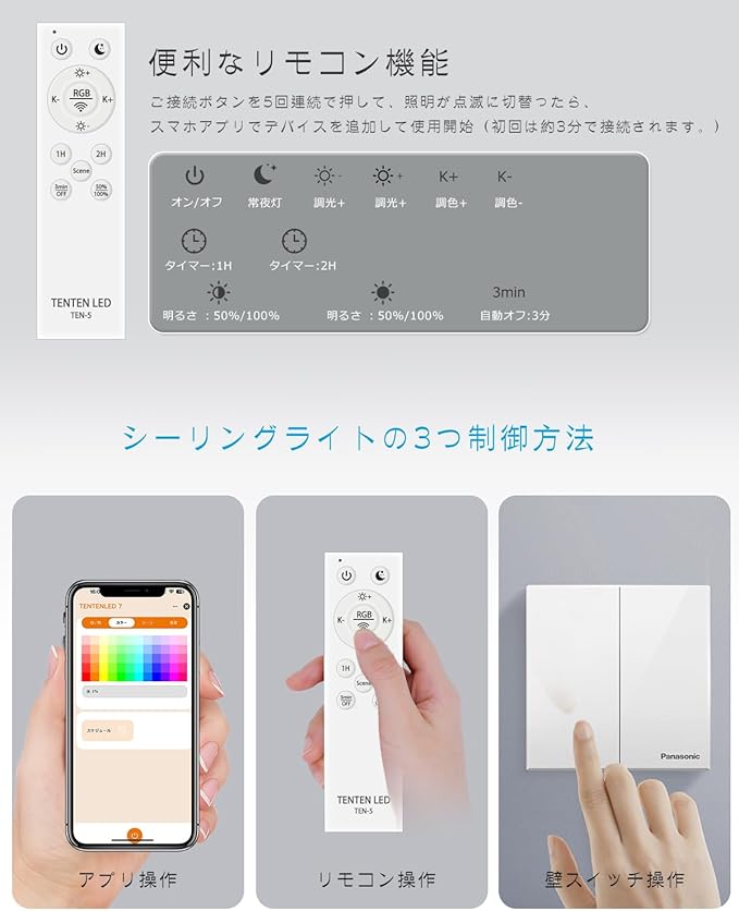 ✅【リモコン & スマホ操作】❶リモコンのペアリング:シ一リングライトの電源を接続した後、2秒~60秒以内にリモコンの「RGB」ボタンを5秒間押し続けてください。シーリングライトが点滅した場合、リモコンとシーリングライトのペアリングが成功したことを示しています。➋2.4Gリモコン:最大20m範囲で操作可能,操作が簡単です。➌スマホ操作:【Tuya smart】アプリでも簡単操作、省エネでスマート、生活の質を向上させます,リモコン無くても安心!
