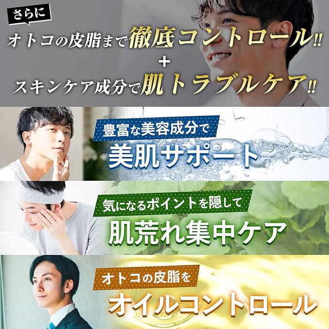 【男性の肌に特化したスキンケア成分配合】 男性ならではのお悩みに対するスキンケア成分(セラミド・加水分解ヒアルロン酸・ツボクサエキス(CICA)・ダイズ種子エキスなど)をしっかりと配合。さらに、使いやすさを考慮して5つの無添加項目(パラベン・エタノール・合成着色料・紫外線吸収剤・動物由来原料)を実現しています。