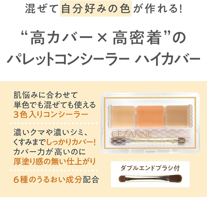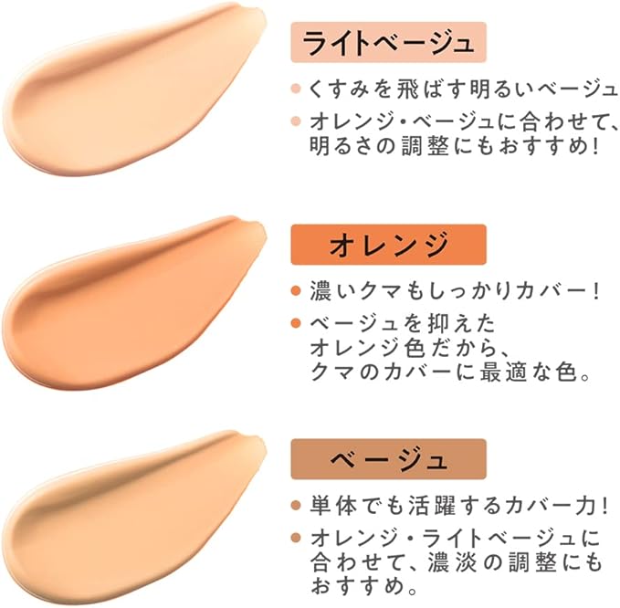 高カバー、高密着タイプ。左から、くすみ、くま、シミをカバーするのに向いたカラー設定。両端ブラシ付き。広範囲には大きめのブラシで、小鼻のわきや目・口角のキワなど、細かい部分には小さめのブラシを使うのがおすすめ。