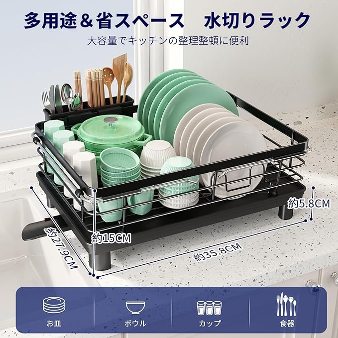 【大容量収納【キッチンの有効スペースが増えてキッチンが一気に明るくなり、物がきれいに整理されます。狭いキッチンスペースを有効に使いたい人にぴったりの食器水切り。一人暮らしまたは2〜3人の小家族にオススメです。