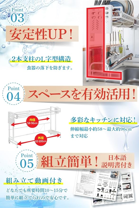 【安定性UP】2本支柱のL字型構造で食器の落下を防ぎます。耐久性に優れた炭素銅を使用しており、水回りの環境でも安心して使用できるように設計されております。