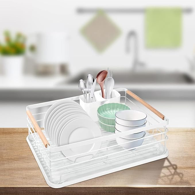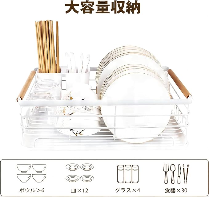 水切りラック 食器 水切りかご 食器乾燥ラック 横置き 錆びない 木製ハンドル 大容量 キッチン収納 ディッシュラック 皿立て 箸収納 多機能 持ち運び簡単 組み立て不要 省スペース ホワイト | etshop