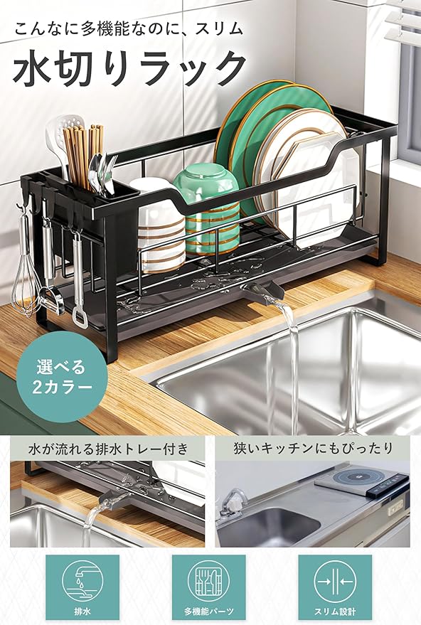 ✅【シンク横スペースを活かしたスリム収納】 キッチンの作業台が狭くてお困りの方に最適な、シンク上設置タイプの水切りラック。限られたスペースでも効率よく収納ができ、洗った食器をそのまま自然乾燥。スリム設計ながら、食器類や調理器具をたっぷり置ける水切りかごです。