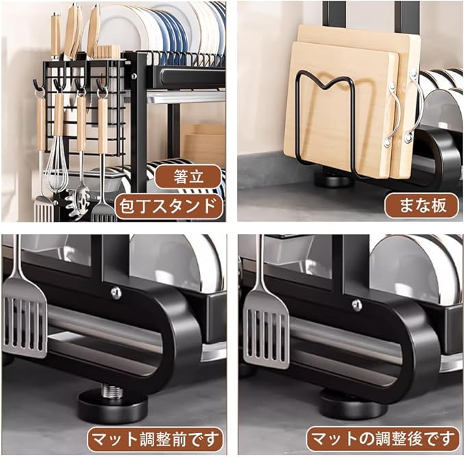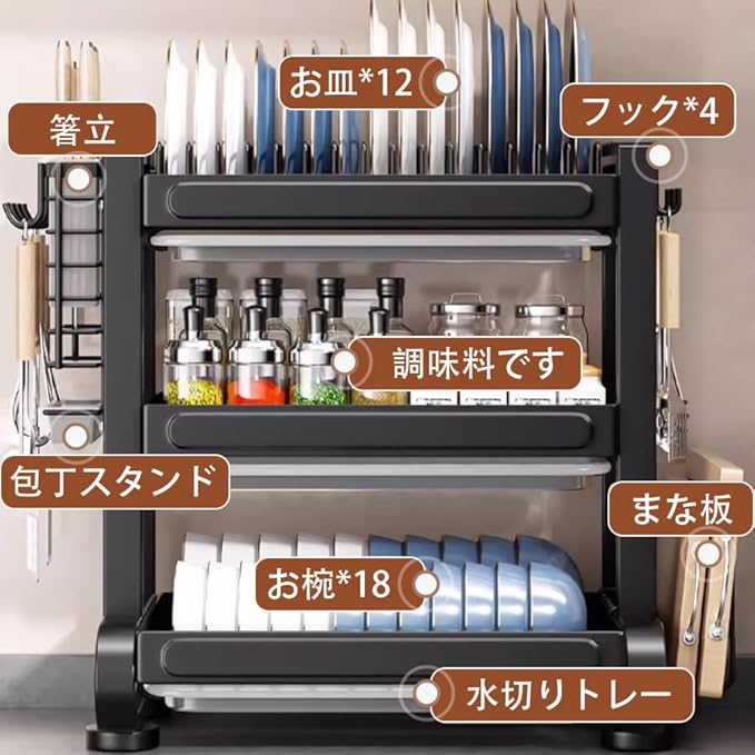 【3段大容量水切りラック】より多くの食器や皿を収納できます。箸立て、まな板立て、包丁立て、フックなどの付属品が付いています。日常生活で使用するあらゆるキッチン用品を収納し、家族全員のニーズに応えます。