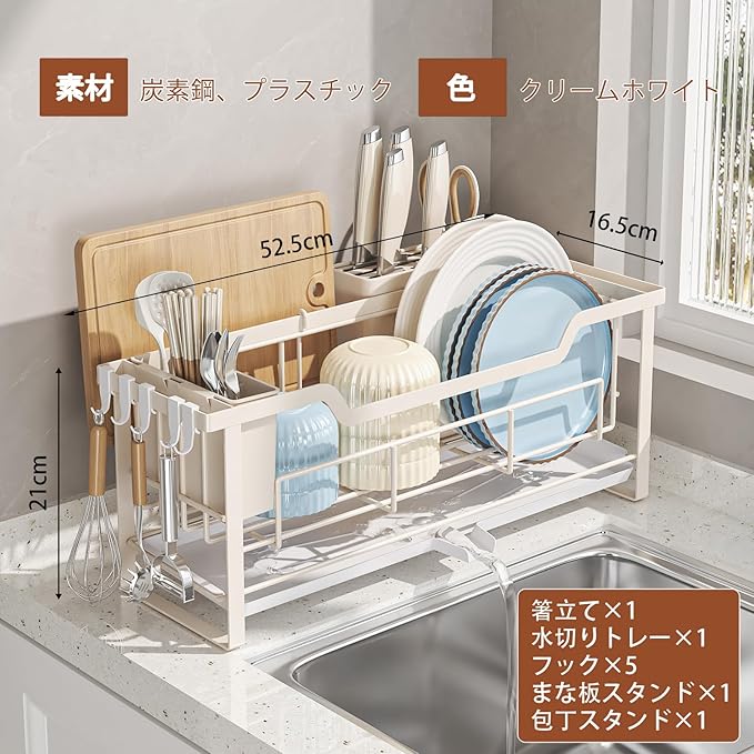 水切りラック スリム 食器 水切り かご シンク上 ラック 大容量 キッチン 箸立て 包丁スタンド まな板スタンド 省スペース 食器乾燥 クリームホワイト 幅52.5*奥行16.5*高21CM