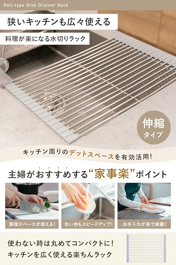✅【丸めて収納できるロール式で省スペース】 使用しないときはクルッと巻いて収納できるロールタイプの水切りラック。シンクの上に広げて使えるので、調理スペースの確保や水切りに便利です。使い終わったら丸めて引き出しや隙間にすっきり収納可能。キッチンを広く清潔に保ちたい方に最適な省スペース設計の水切りラックです。
