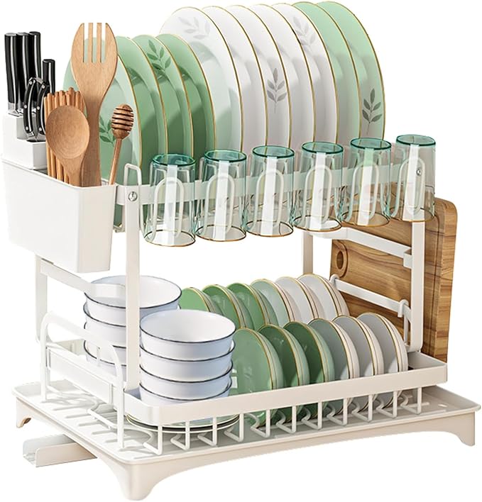 【大容量収納】2段タイプ、まな板受けやカトラリーホルダー付きます。カップホルダーが付き、6カップを保持できます。小皿から大皿まで、様々なサイズのお皿を立ちられます。長いものも立てやすく作られた仕切り付きカトラリー、お箸、まな板、包丁などが収納できます。