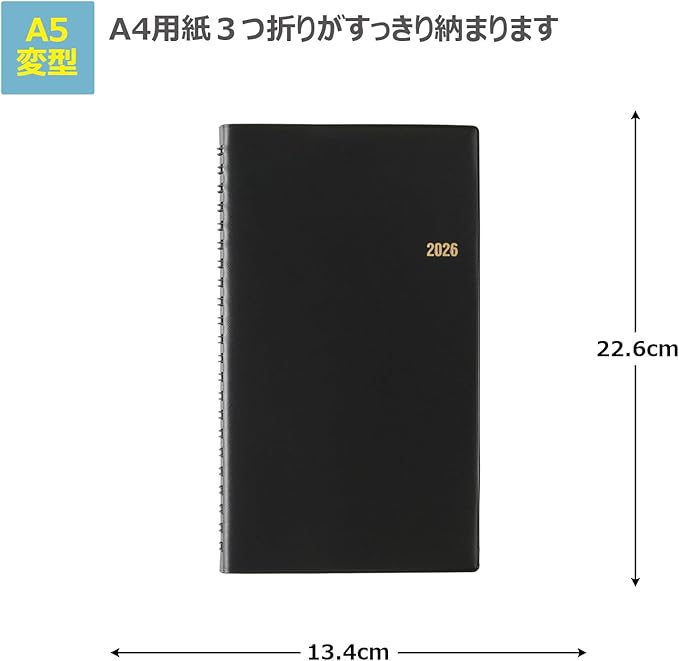 【商品詳細】サイズ:226mm 134mm 15mm / ページ数:160 / 月曜始まり / レイアウト:横ケイ + レフト / 用紙色:クリーム用紙 / 掲載資料(本冊):印紙税・度量衡・地下鉄路線図・年齢早見表 掲載資料(分冊):-