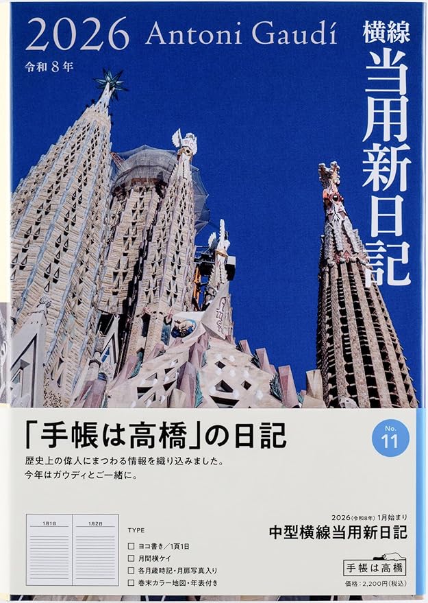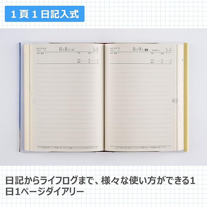 1ページ1日記入形式、横書きのロングセラーの定番日記。毎年テーマに合わせた写真が楽しめる月扉、1日1行の雑学メモなど、日々を綴るのにふさわしい内容。巻末には、オリンピックの記録や金銭出納帳、カラー年表までバラエティに富んだ充実の付録。