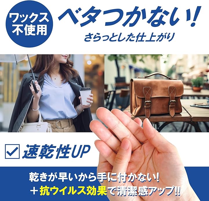 ワックス成分を含まないためベタつかず、サラッとした仕上がりに。乾きが早く、お手入れが手軽に行えます。