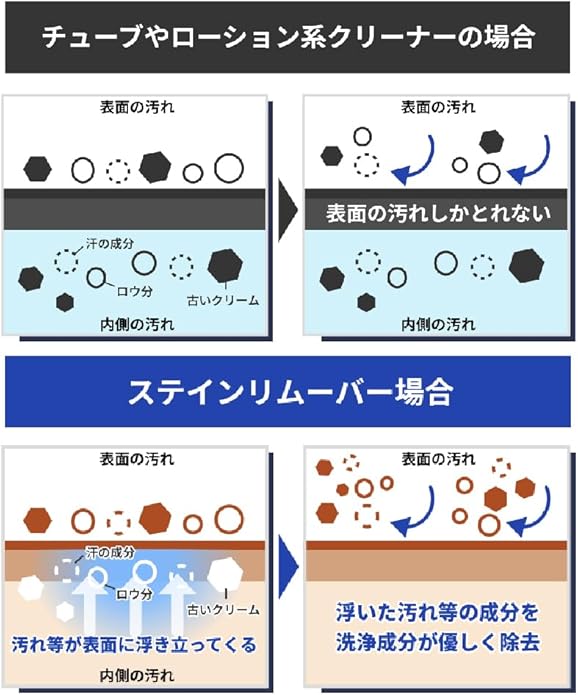 靴の表面の汚れや古いクリームを落とすことにより、クリームの浸透性が向上し、表面の通気性が維持されます。軟水をベースに作られたソフトな汚れ落しですので、汚れ落ちが抜群でかつ皮革に優しいお薦めの靴用クリーナーです。靴クリームの浸透性が向上します。ベタ付きが少なくサラッと仕上がるので、靴、パンプス、サンダルなどのインナー(インソール)の汚れ落しにも使用できます。雨の後ににじみ出てくる白い汚れ(塩分)もきれいに落ちます。お徳用ラージサイズです。