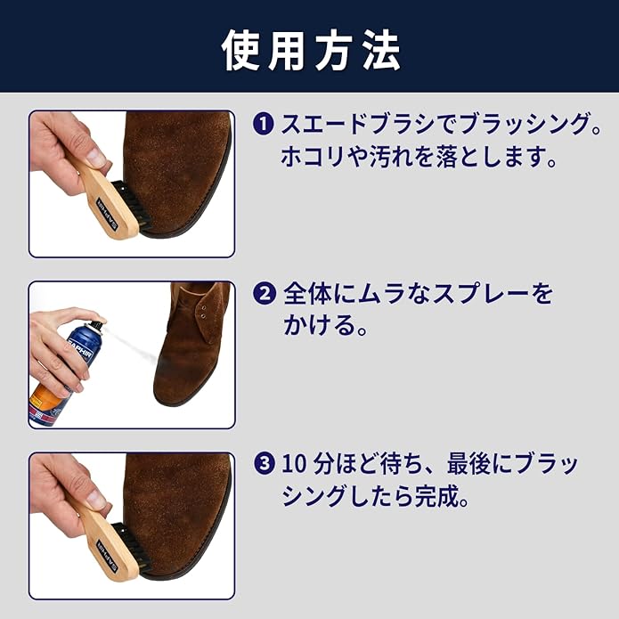 ●スエード製品を使用する前のプロテクトや、使用後間もない軽い色あせにもピッタリです。