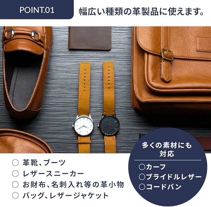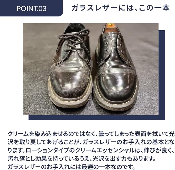●皮革に潤いと栄養を与えながら自然なツヤを与え、同時に表面についた汚れを落とします。●動物性油脂ラノリンの配合により皮革の柔軟性も維持します。●ビーズワックス(蜜ロウ)のエッセンスを配合したソルベントフリーの皮革用ナチュラルローションです。◆特にコレにおすすめ! ◆→ブーツ・バッグ・ウェアなどの面積の広い革製品皮革の表面をスゥ〜っとすべって行くなめらかさを是非実感して下さい。ちなみに・・・コードヴァンにもご使用いただけます! ! フタを閉めたまま容器をよく振り、柔らかい布にクリームエッセンシャルを適量含ませて軽く拭いてください。・乾拭きをして仕上げてください。※ご使用の際はあまり強くこすらないようにしてください。■注意●上記の用途以外には使用できません。●スエード、ヌバックなどの起毛皮革、ハ虫類皮革、シープ、ラム皮革製品には使用できません。●ヌメ革、ナッパ、アニリン染めの仕上げの皮革製品には使用できません。●新品のロウ(表面の白い粉)が残っている状態のブライドルレザーには、当製品は不要です。●ナチュラルな天然油脂を使用していますがアレルギー対策商品ではありません。●子供の手の届かない所に保管して下さい。●色落ち、シミ、色ムラ、変色する特殊な皮革もありますので、予めご了承の上、目立たない部分でテストしてからご使用ください。●クリームエッセンシャルは少量使用してください。多く使ってしまうと表面に成分が白く残ってしまう場合があります。●使用後は仕上げに必ず馬毛ブラシと柔らかい布を使用してください。●成分が表面に残ってしまった場合は水性クリーナーを使用してください。