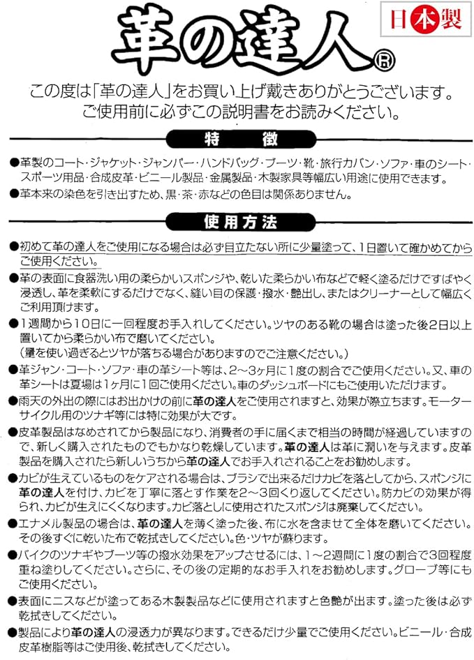 【ご使用上の注意】必ず一度目立たない場所で試し、1日置いて問題がないか確認した上でご使用ください。スエード、バックスキン、ヌバック、セーム革等起毛素材のものには適応しませんのでご使用しないでください。