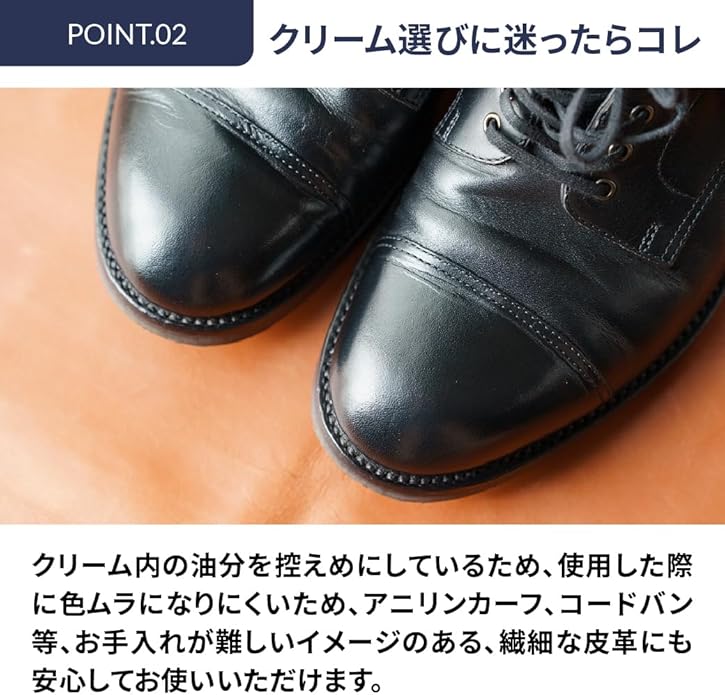 アニリンカーフ等の繊細な皮革靴に使用可能なソフトレザー靴用栄養クリームです。皮革に潤いと栄養を与えながら透明感のある自然な光沢を与えます。新品の靴などにはお薦めの逸品です。無色ですので靴の色は問わず使用できます。