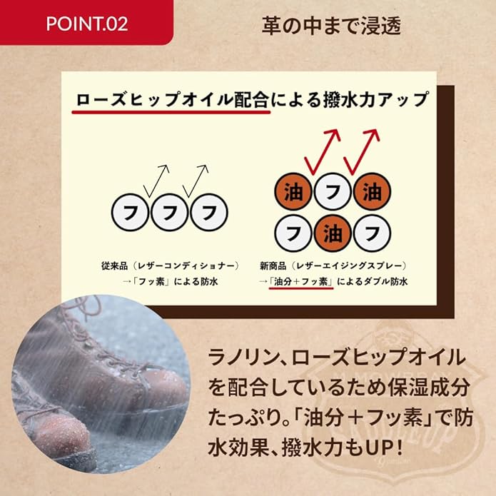 【防水・栄養スプレー】「油分+フッ素」でのダブル防水をおこなうことにより、“ 雨 " や “ 汚れ " を弾く効果があります。・スムースレザー、ソフトレザー・スエード、ヌバック、ムートン・デリケートレザーこれらの素材が使われている革靴、ブーツ、ジャケット、カバンなど、幅広いアイテムへ栄養を与えます。スプレーには「フッ素」の他に、・ラノリン・ローズヒップオイルという自然由来の成分を配合しています。定期的にスプレーをかけることで、・色あせの防止・潤い、柔軟効果 ・高い撥水力を実現しやすくなります。「スエード部分を避けてクリームを塗るのはめんどくさい」「色々な素材が組み合わさっていて、お手入れ方法が分からない」「たくさんの種類の靴を持っているけど、ケア用品はすくなめにしたい」という方でも、この1本だけで簡単にお手入れができます!