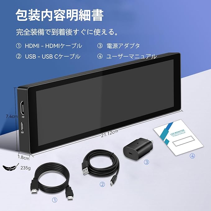 小型タッチパネルモバイルモニター7.8インチHD 1280x400PミニポータブルモニターAIDA64 PC CPU RAM のHDMI USBC IPSディスプレイ、輝度350cd/㎡、キックスタンド内蔵
