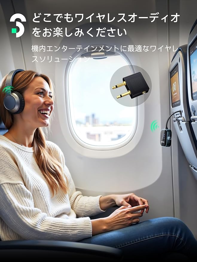 【LCDスクリーンデザイン】:SOOMFON bluetooth トランスミッターディスプレイを搭載しており、接続されているデバイスを簡単に確認でき、動作モード、デバイス名、接続状態、バッテリー残量、音量などのリアルタイム情報を一目で把握できます。操作も簡単で持ち運びに便利です。飛行機用オーディオアダプターも搭載しており、3万フィートの高度でもワイヤレスオーディオを楽しめます。