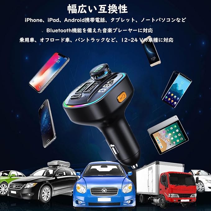 【7 色 LED ライト丨 3 つのモード&広範な互換性】この FM トランスミッターには柔らかい 7 色変換可能な LED ライトが搭載されています。3 つのモードがあり、ボタンを押すだけで調整できます。入力電圧は 12~24V、周波数は 87.5~108Mhz で、一般的な 12V 車種や 24V トラックなど、全ての車種に対応しています。また、この車用 Bluetooth トランスミッターは iPad、iPhone、Samsung、Google、LG、HTC などと互換性があります。