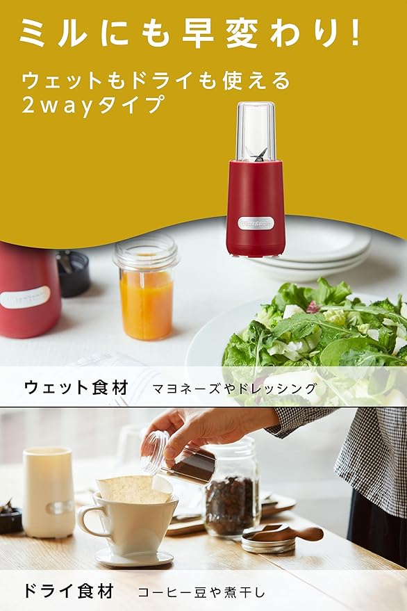 ✅【ブレンダーとミル兼用のブレードで、カップを変えるだけ】独自開発のブレンダーとミル兼用ブレードを使えば、カップを変えるだけで、コーヒー豆から挽きたてのコーヒーを楽しめます。面倒な準備や洗い物も少なく、忙しい朝にもぴったりです。