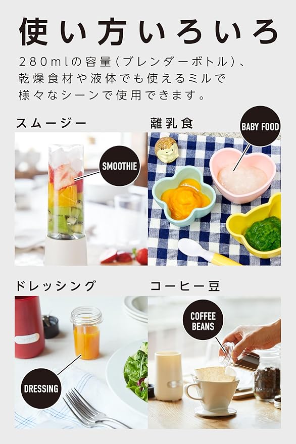 ✅【280mlの飲みきりサイズ】280mlの飲みきりサイズで、スリムなフォルム。直径約7.6cmのコンパクトサイズのスムージーミキサーなので狭いキッチンにも置きやすく、収納しやすいのが特徴。スリムなフォルムがスタイリッシュなのでインテリアとしてもおすすめ。