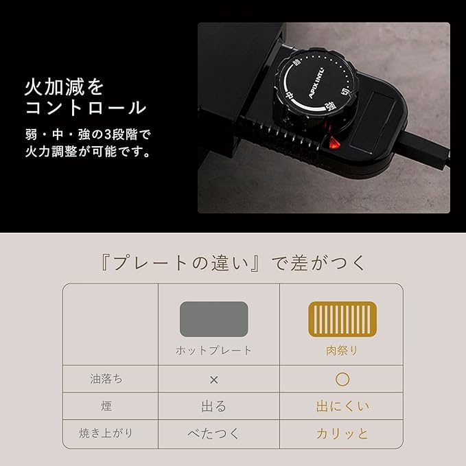 焼肉屋のグリルホールを再現した特別なプレート!一般的なホットプレートと比べるとスリット穴がないため、余分な脂を落とすことで煙が出にくくなります。室内でもスモークレスで本格的な焼肉を楽しめます。※ご使用前に油受けプレートに水約300ccを入れてください。