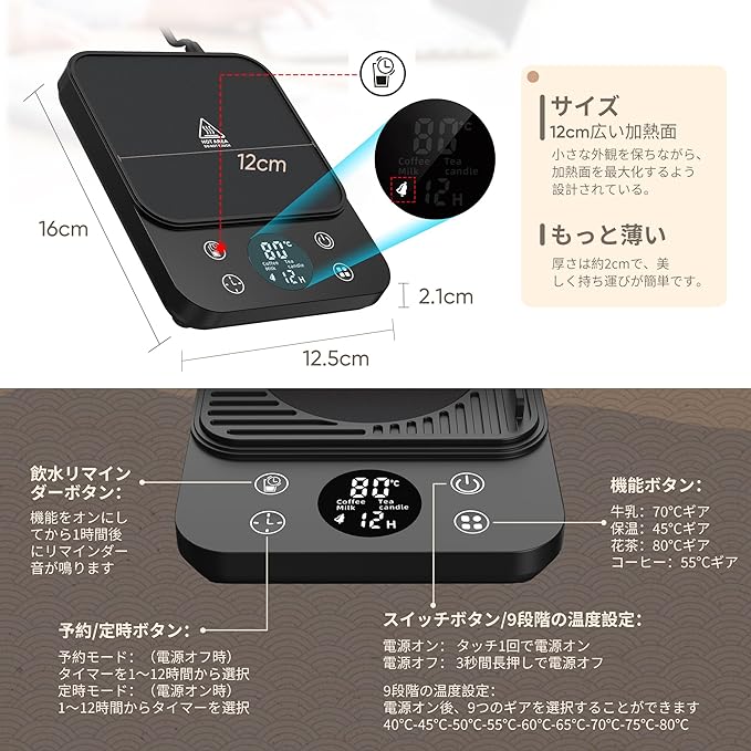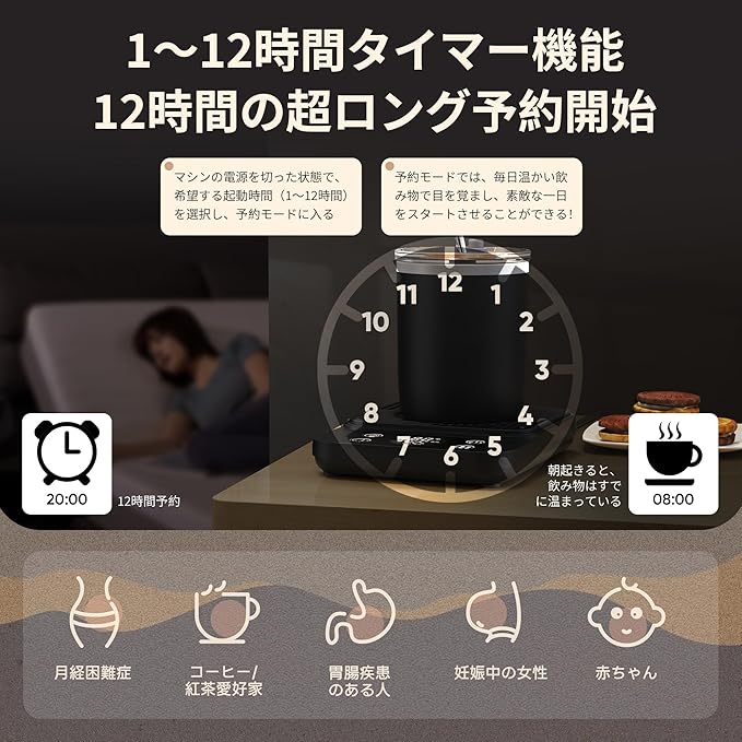 「予約モード・パーフェクトな贈り物」12時間の超ロング予約開始。予約モードでは、毎日温かい飲み物で目を覚まし、素敵な一日をスタートさせることができる!使いやすく、授乳中のお母さん、お子様、お年寄り、オフィスワーカーに最適です。誕生日、バレンタインデー、感謝祭、クリスマス、母の日、その他の祝日に、家族や恋人、友人へのプレゼントに最適です。コーヒーカップウォーマーがあれば、24時間温かい飲み物が楽しめる。オフィスや自宅での使用に適しています。