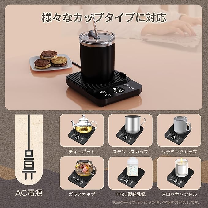 「12cm広い加熱面 ほとんどのカップに対応」カップウォーマーは小型であることを基本に、加熱面積を拡大し、より多くのサイズの容器に適している。デザインはさらに薄く、わずか約2センチで、持ち運びが便利です。カップ底の直径12cm以内の耐熱グラス、セラミックカップ、ステンレスカップ、PPSU製哺乳瓶、ティーポット、箱入りミルク、開封した飲料缶、アロマキャンドルなどに対応可能です。実際のカップの材質やカップ底面の厚さによって具体的な保温温度は異なります。