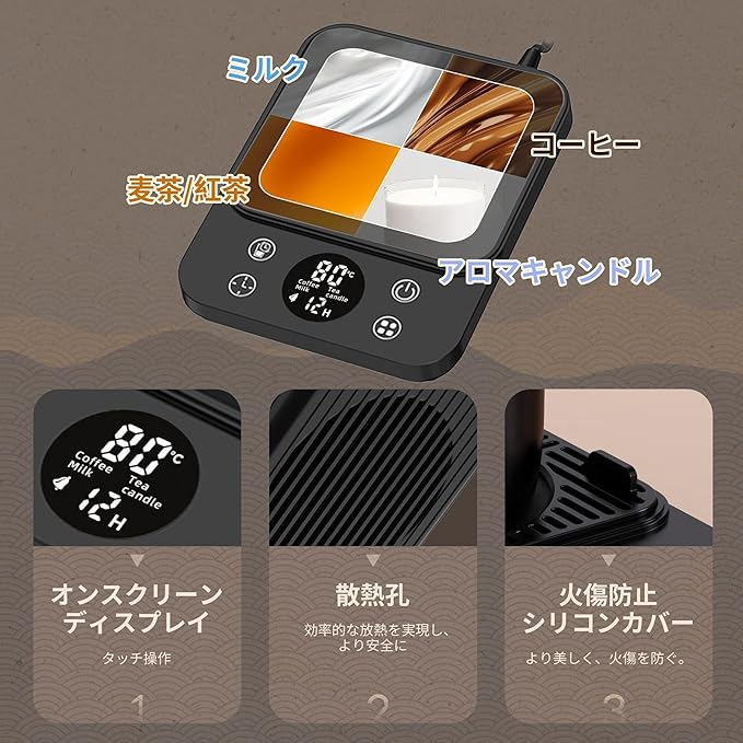 「9段階の温度設定・重さの制限がない」カップウォーマーには9段階の温度設定があり、飲み物の温度を40℃、45℃、50℃、55℃、60℃、65℃、70℃、75℃、80℃に維持することができます。操作が簡単で、どんな重さのカップでも温めることができます。使用制限はありません。連続保温で、良い一日はホットミルクから始まります。