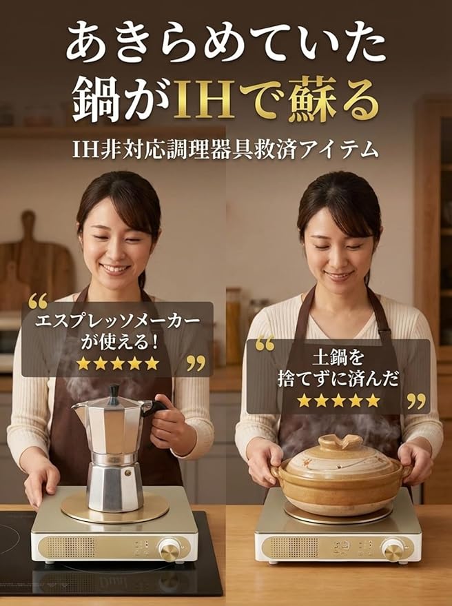 【直径14cmのミニプレート】このIHヒーティングプレートは、幅20cmと16cmの2種類があります。これはほとんどのIHコンロのサイズに適合するように日本のご家庭向けに制作しました。そのため、一人暮らしの方からファミリー向けの調理に最適です。IHクッキングヒーターを使用して、一人鍋やエスプレッソHOTを楽しむことができます。