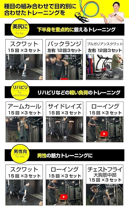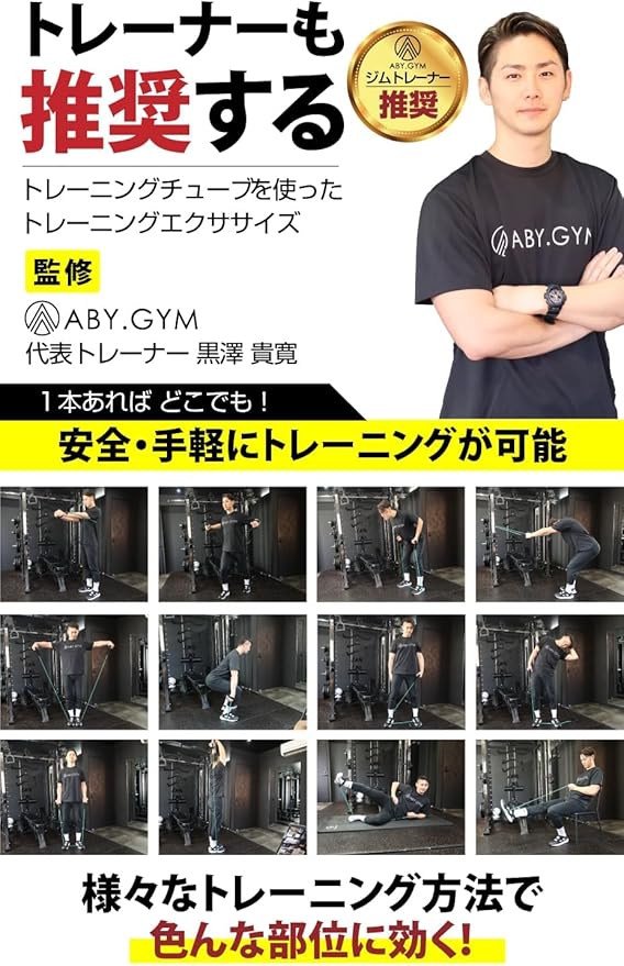 例えばこんな部位が鍛えられます 肩 胸 腕 首 背中 腹 下半身 上半身 太もも お尻 尻 脚 足 二の腕 インナーマッスル 体幹。安心、安全に筋力トレーニングや各種ストレッチなども行うことができます。チューブの張力を利用して様々な角度から負荷をかけて、鍛えたり伸ばすことが可能です。