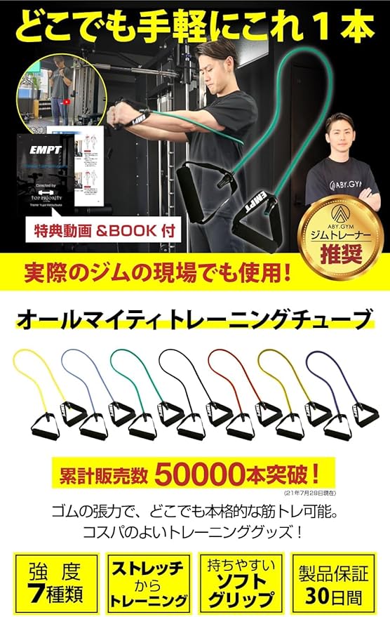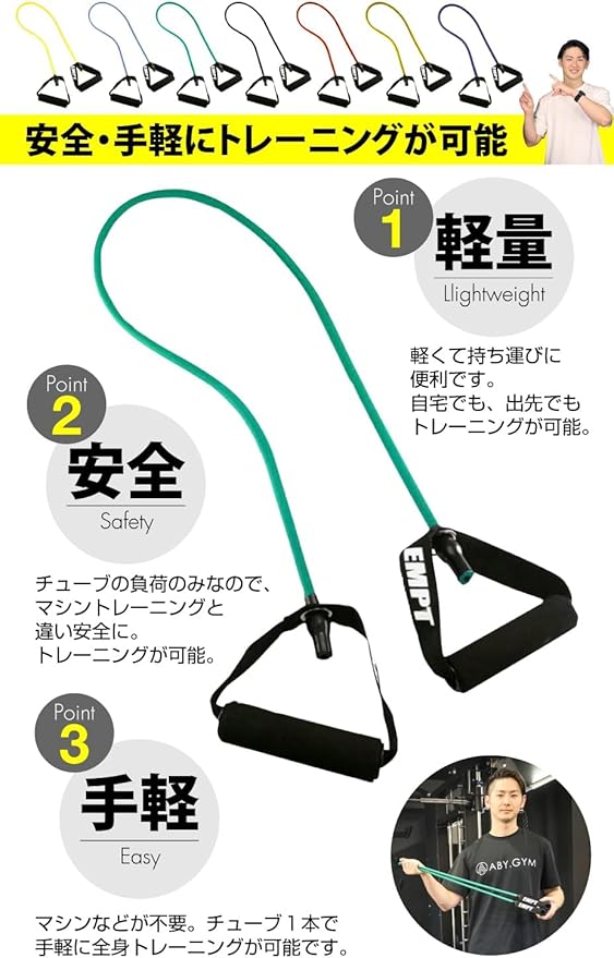 全身の様々な部位が鍛えられます。ソフトタイプ、レギュラータイプ、ハードタイプ、スーパーハード、ウルトラハードの5種類のラインナップで、目的に合わせてチューブの強度を選んで下さい。筋トレ目的からストレッチ、リハビリなど。伸縮チューブで安全にトレーニング。強い負荷でのトレーニングも怪我の心配が少なく安全に行えます。