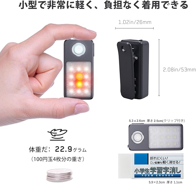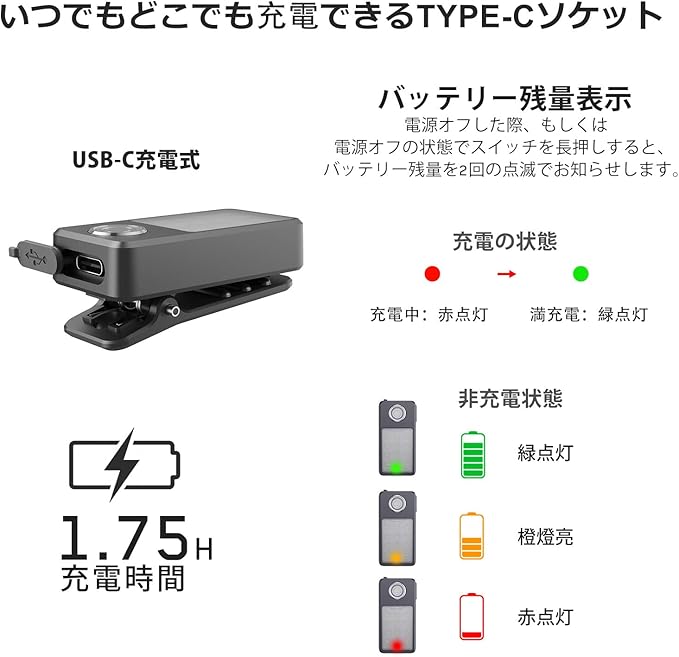 ランニングライトUSB-C充電式、3段階調光、アップグレード版2-in-1クリップライト、土砂降りOK防水コンパクトLED懐中電灯、【広角とスポット2タイプxモード記憶機能x軽量22.9gxIPX7防水】 | etshop