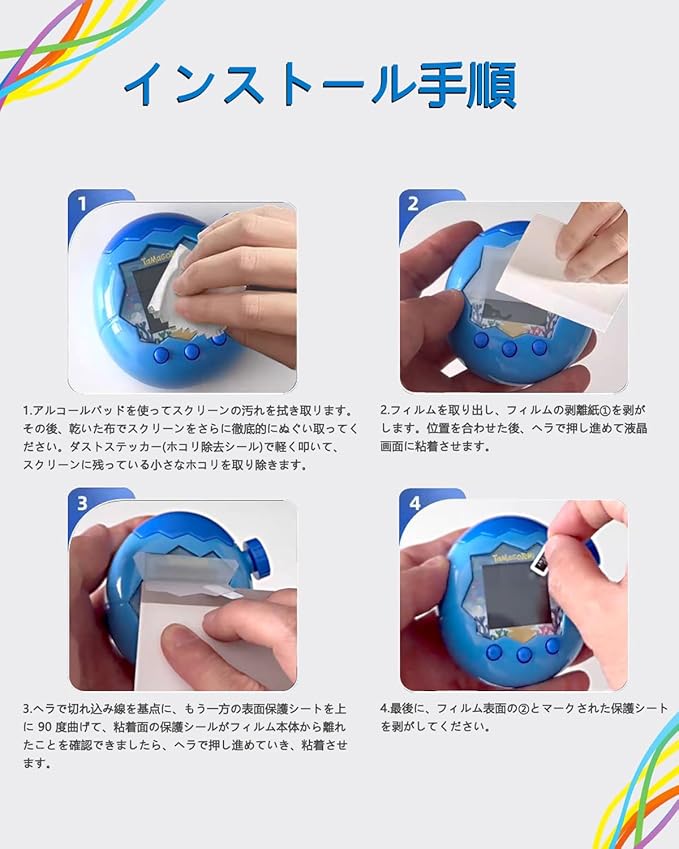 【対応機種】対応 たまごっちパラダイス 保護フィルム、合計5枚セット。非常に柔らかいTPUをしており複合材 炭素繊維を採用、画面の端まで保護することができ、たまごっちパラダイス独自のデザインを損なわず、まるでフィルムを貼ってないようです。
