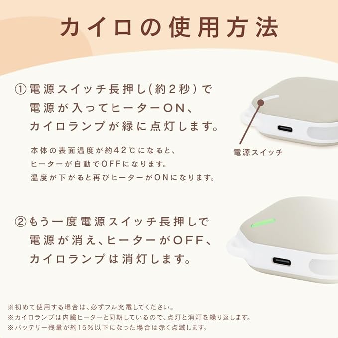 スイッチ入れて約10秒、何度も使えてぽかぽか温まる充電式カイロです。