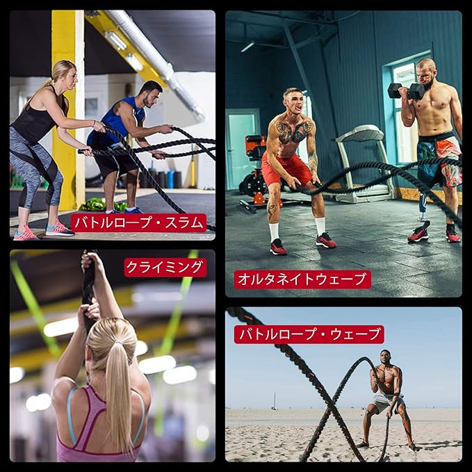 【バトルロープとは】ベーシックバトルロープ(ジムロープ、トレーニングロープ)はロープを振ることにより、全身の筋肉が鍛えるトレーニンググッツ。筋肉訓練だけではなくバランス能力や瞬発力、心肺機能にも向上させる