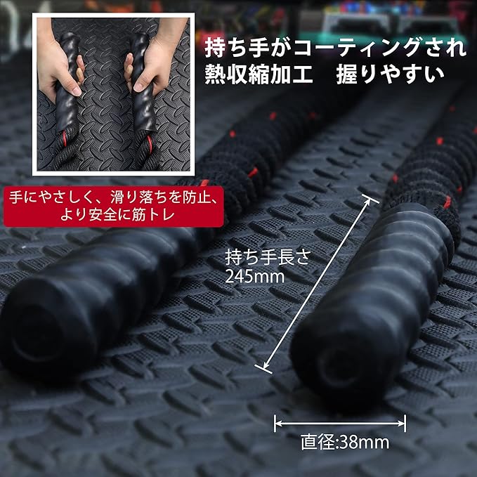 【高品質素材 耐久性抜群】ロープはポリエステル製のため、より耐久性がある。長さ24.5cmの持ち手がコーティングされ、熱収縮加工で手にやさしく、滑り落ちを防止、より安全にトレーニング。長さ40㎝ポリエステル製保護カバーが付き、摩耗により耐え、長時間に使用可能。