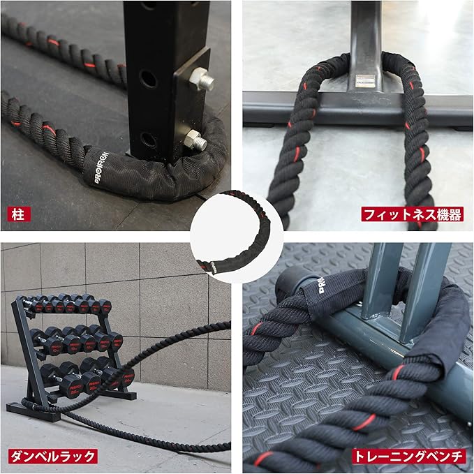 【設置はとても簡単 体幹を鍛え】バトルロープの中央辺りにダンベル等の重りを設置し、巻きつけたり、柱に巻きつけるだけでトレーニングができ、重いバトルロープを振り続けると上半身だけじゃなく、全身が鍛え上げられ達成感がすごい。鍛えたい部位によって、いろいろなトレーニング方法があり、試してみましょう。