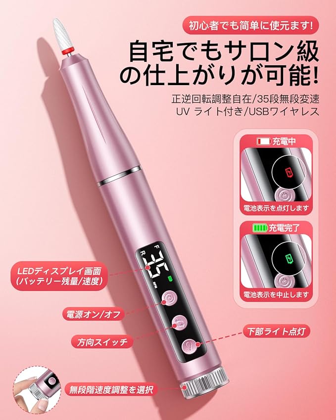 電動ネイルマシン 爪磨きネイルライト 2in1 多用途 ネイルマシーン、甘皮処理 ネイル除去から UV ジェルの硬化まで 35段無段階調速 最大25000rpm 正逆回転 USB給電 超静音設計 65g超軽量設計セルフネイル 12種類のプロフェッショナルビットと36個のサンディングバンドを含む、日本語取扱説明書付属のため (ピンク) | etshop