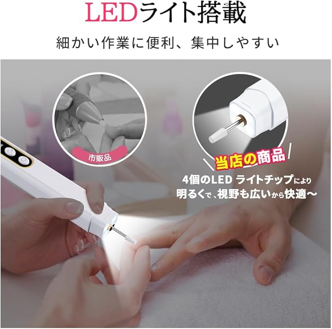 「安全で使いやすい & LEDライト搭載」:ドリルビットは工具なしで簡単に交換できます。引き出して、差し込むだけで完成!4つの高輝度LEDライトが付いており、手元を明るくなり、細かい部分もちゃんと見えます。ネイルケアがより手軽に~
