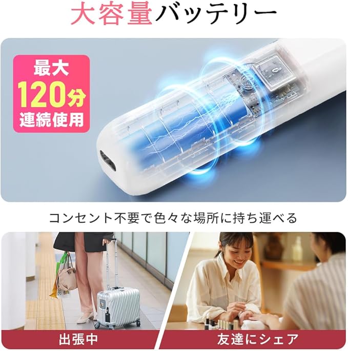 「USB充電式 & コンパクトで使いやすい!」:ネイルオフマシーンは電源に差し込む必要はありません、1時間充電すると、120分間連続使用できます。もちろん、電源を接続しながら使用することもできます。家庭用にも業務用にも最適です。コンパクトなサイズで外出、旅行や出張の持ち運びに便利!