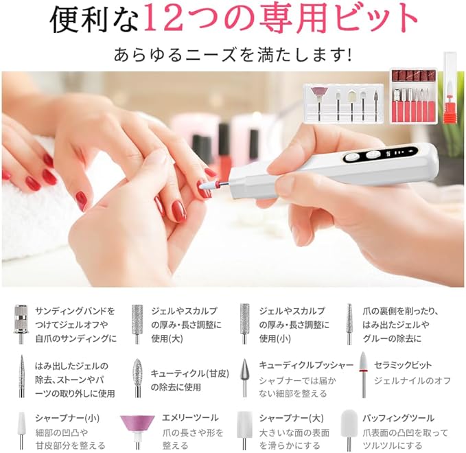「12in1多機能ネイルケアセット」:セラミックビット1本とステンレスビット6本、ネイルマシンドリルビット5個、サンディングバンド6つを付属していますのでネイルの処理、研磨、カット、ネイルカービング、角質除去など様々な用途にお使い頂けます!サロンに行く必要がないし、ネイルサロン代も節約し、自宅でネイルケアを楽しめます。